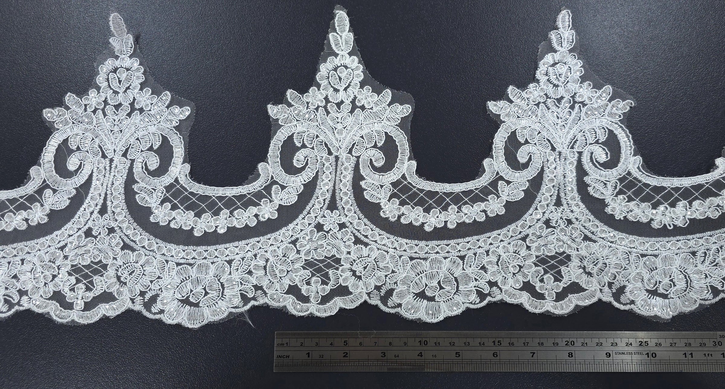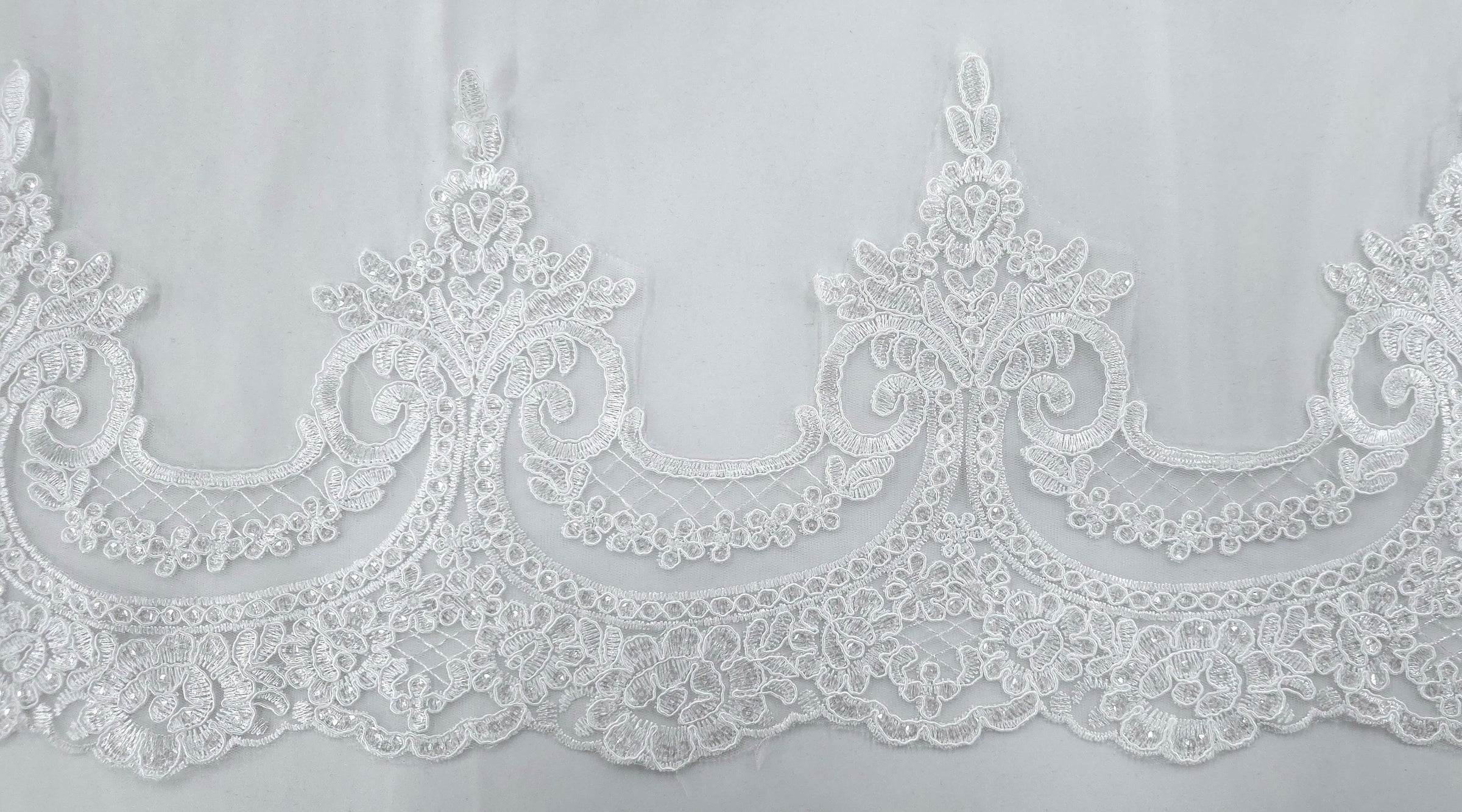 Scalloped floral lace trim featuring cord and sequin detailing on a tulle background