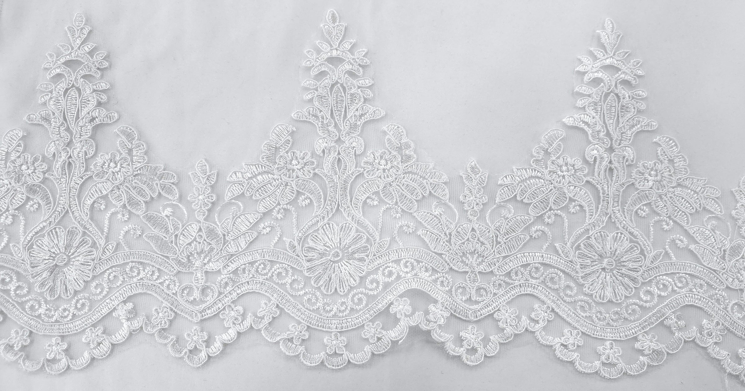 Scalloped floral lace trim featuring cord and sequin detailing on a tulle background